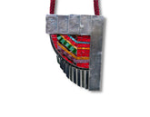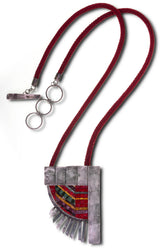 Oxidized, wrinkled silver and hand cut venetian glass tiles on a maroon fabric necklace