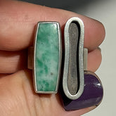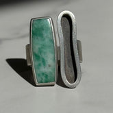 The juxtaposition of the light green color and the blackened silver along with the sharp lines of the stone and curves of the silver form truly sets this ring apart.