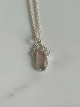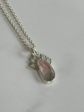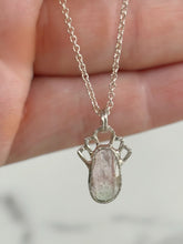This rosecut watermelon tourmaline is set in a sterling silver art deco setting, hung from an 18" chain. Due to the translucency of the stone the color will shift depending on what color its worn on.