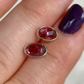 Two rosecut pink tourmalines set in sterling silver. The stones are asymmetrical so they are similar in size, but not exact. The stones have a slight translucency which will cause them to look a bit darker when worn.