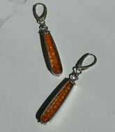 These drop earrings have a string of carnelian beads down the center of an elongated silver oval and hung from a secure lever back silver hook and a couple links of hand made loop in loop chain.