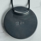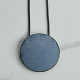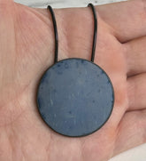 The 'stone' of this necklace is made from dyed coconut shell and it is set in oxidized sterling silver. It is a medium cool blue color hung from an oxidized, 18 inch snake chain.