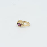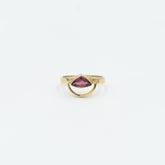 A flawless, berry-red spinel with an asymmetrical cut is set with a little halo of gold. Open backing on a tapered 14k band. Size: 8