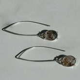 The elegance of a long dangle earring with the simplicity of a single stone, included quartz, prong set, dangling from the ear hook. These earrings can be worn daily or for a fancy event, they will bring a touch of elegance to any outfit. The included stone is fairly translucent causing it to look different depending on the angle and what is behind it.