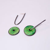 Dyed coconut shell interchangeable discs set in oxidized sterling silver. The disc slides onto an oxidized silver hook with sterling silver post earring. Different colored discs sold separately.