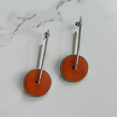 Dyed coconut shell interchangeable discs set in sterling silver. The disc slides onto a silver hook with sterling silver post earring. These discs are a pretty orange color, very pumpkin colored, making them perfect for fall. Different colored discs sold separately.