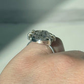 The prong mounting for this ring is completely hand fabricated out of argentium silver. This roscut quartz stone contains lepidocrocite inclusions giving it a unique look. The stone is mostly translucent so the color varies slightly on versus off the finger.
