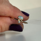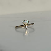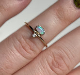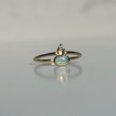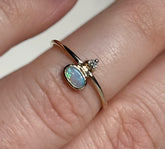 This gorgeous opal is set in 14k gold with a moissanite accent. The beauty of this opal is difficult to capture on camera, it is a light blue with mostly green flashing and a bit of orange. The stone has a slight translucency which will also cause the color to shift a bit when worn.