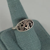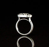 The Rami Ovali Ring is made out of 6.2 grams of oxidized sterling silver. The top design has a width of 11mm and the shank is 3.5 mm thick. The ring has an approximately 7mm rise off the hand. This piece is handcrafted, and hand engraved all the way down to the shank! The box construction highlights the contrast of light and dark in the piece.